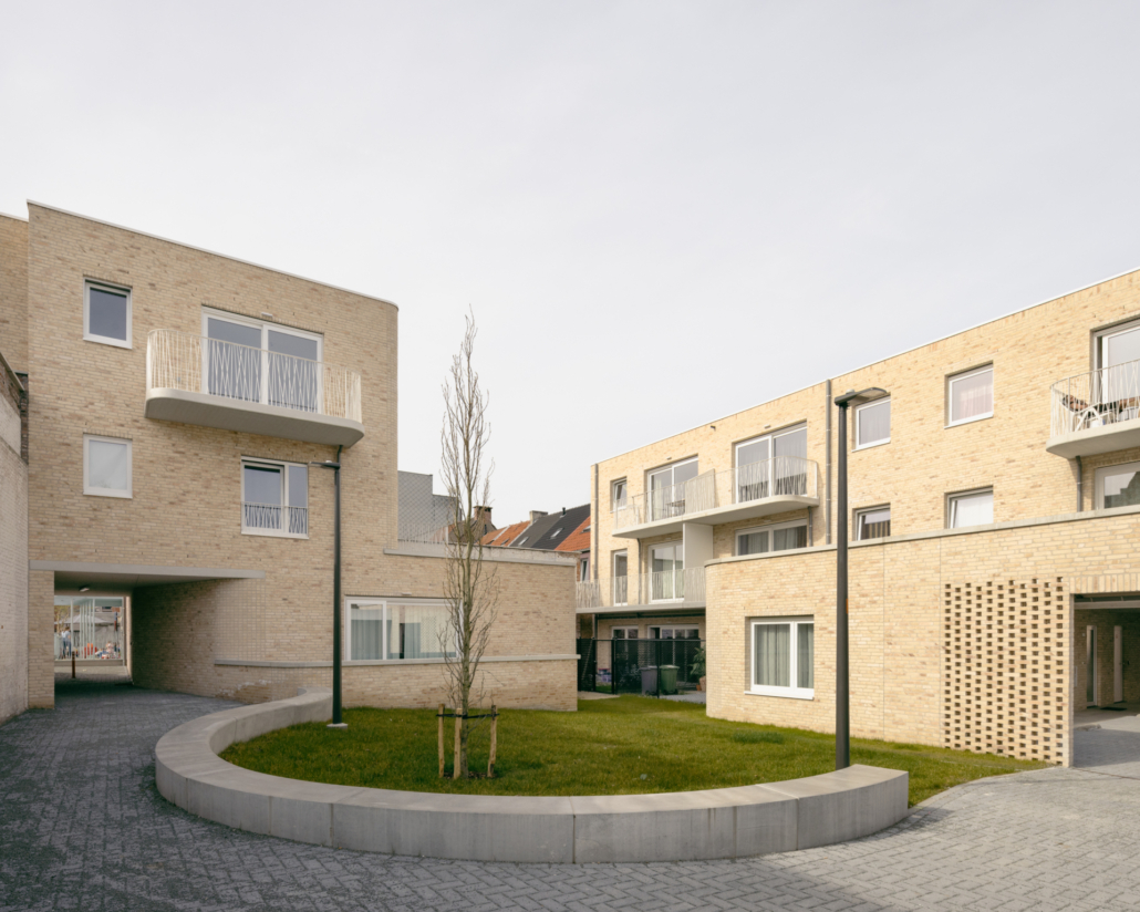 De publieke binnentuin is opgevat als een groene buitenkamer, omarmd door de bestaande tuinmuren en de nieuwe gebouwen. Het pad dat de verbinding maakt tussen de Sint-Rochus-site en de Mercatorstraat, loopt door die tuinkamer.