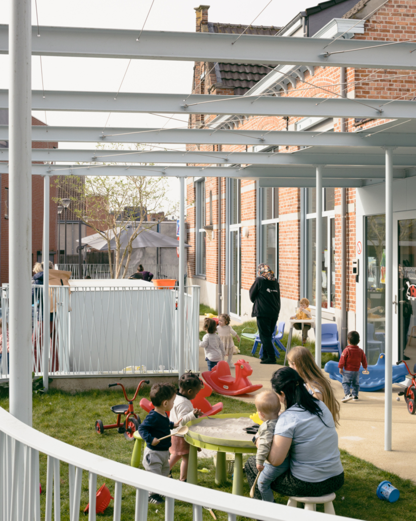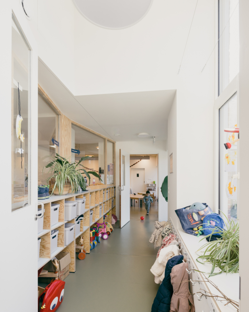 Bij het ontwerp van de binnenruimtes is niet enkel rekening gehouden met functionele en wettelijke vereisten zoals brandveiligheid en hygiëne, maar werd ook gestreefd naar een warme, huiselijke sfeer. Door de integratie van speelse elementen op kindermaat, zoals ingebouwde speelplekjes en het gebruik van zachte kleuren, ontstaat een omgeving waar kinderen zich vrij kunnen bewegen, ontdekken of even terugtrekken.