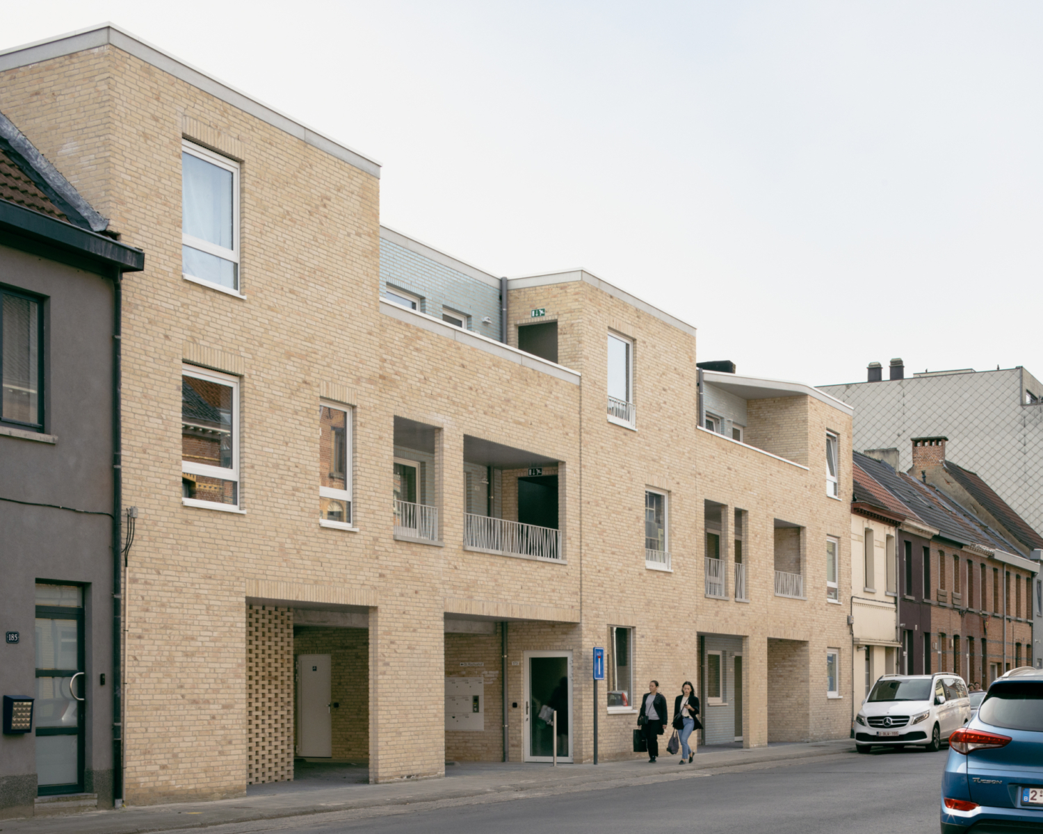 De Mercatorstraat bestaat hoofdzakelijk uit rijhuizen. De gevel van het nieuwe gebouw is een knipoog naar deze typologie van rijhuizen. Door de subtiele positionering van voegen, het spel van verschillende types raamopeningen en variërende accenten per “travee”, toont de gevel zich qua vormentaal als 5 woningen in de rij, waardoor het gebouw zich aanpast aan de schaal van de omgeving. De grondgebonden appartementen krijgen elk een eigen toegangsdeur, de appartementen op de verdiepingen zijn toegankelijk via de gemeenschappelijk inkom die toegang geeft tot de open passerelles aan de straatzijde.