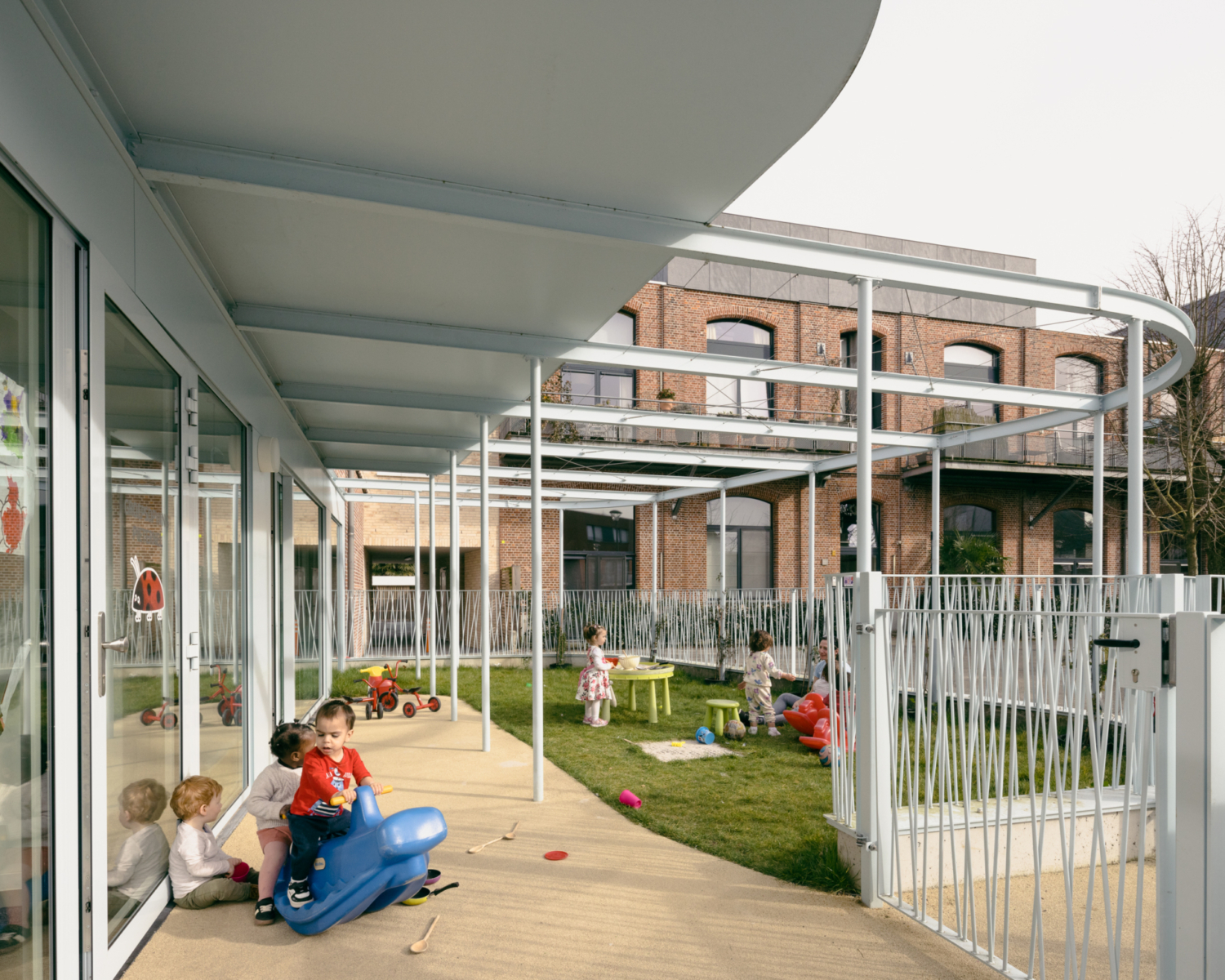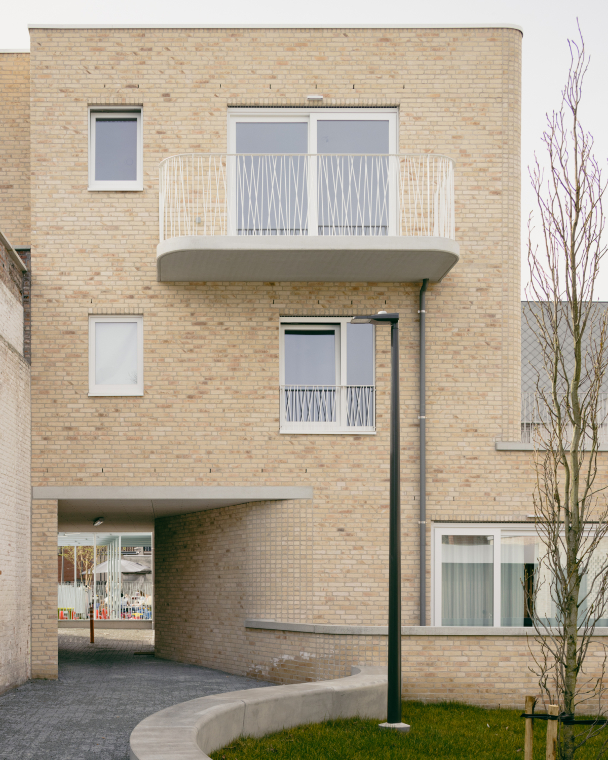 Bij het ontwerp van de binnenruimtes is niet enkel rekening gehouden met functionele en wettelijke vereisten zoals brandveiligheid en hygiëne, maar werd ook gestreefd naar een warme, huiselijke sfeer. Door de integratie van speelse elementen op kindermaat, zoals ingebouwde speelplekjes en het gebruik van zachte kleuren, ontstaat een omgeving waar kinderen zich vrij kunnen bewegen, ontdekken of even terugtrekken.