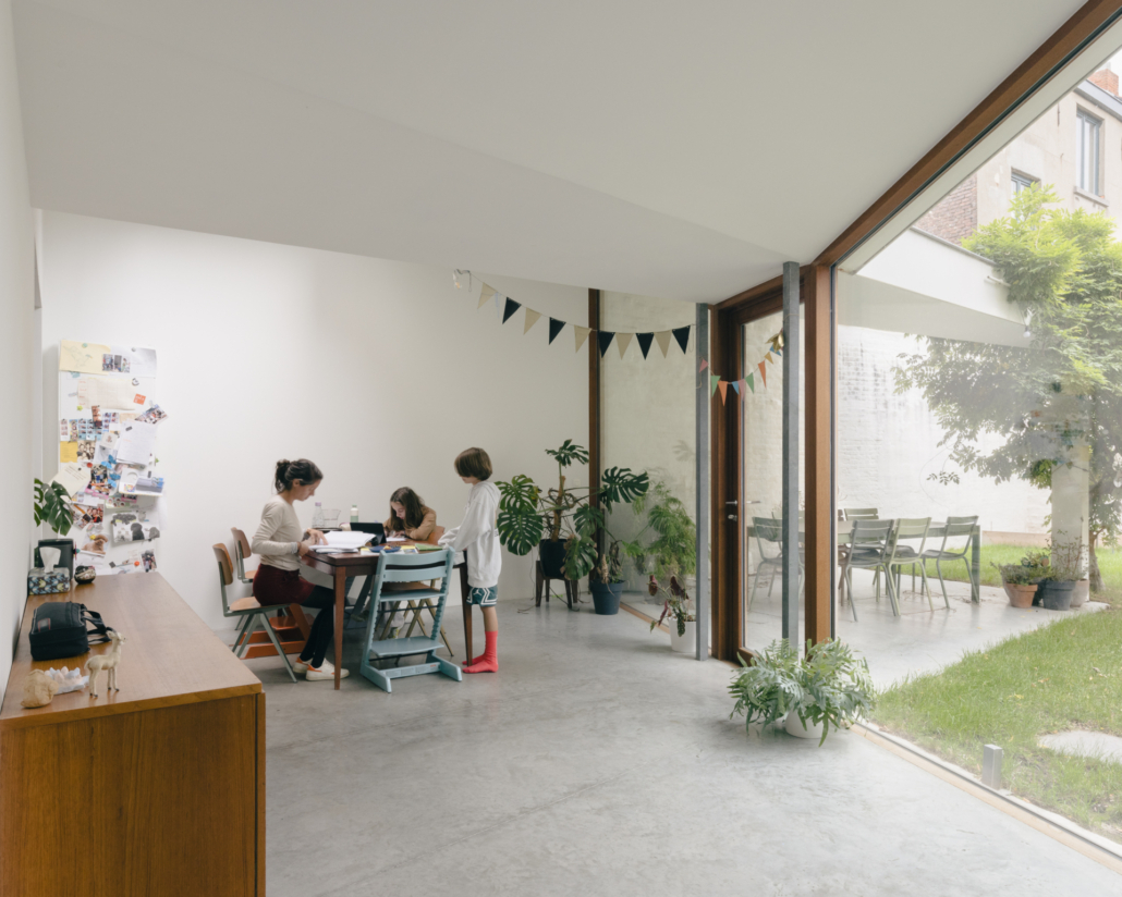 De binnenruimte verbindt de linker -en rechtervleugel van het bestaand gebouw en biedt plaats aan de eetruimte. Door deze verschuiving kan de keuken naar achter geplaatst worden met zicht op de tuin. Vooraan komt zo ruimte vrij voor een (fietsen)berging, verborgen achter de vestiaire in de inkomhal.