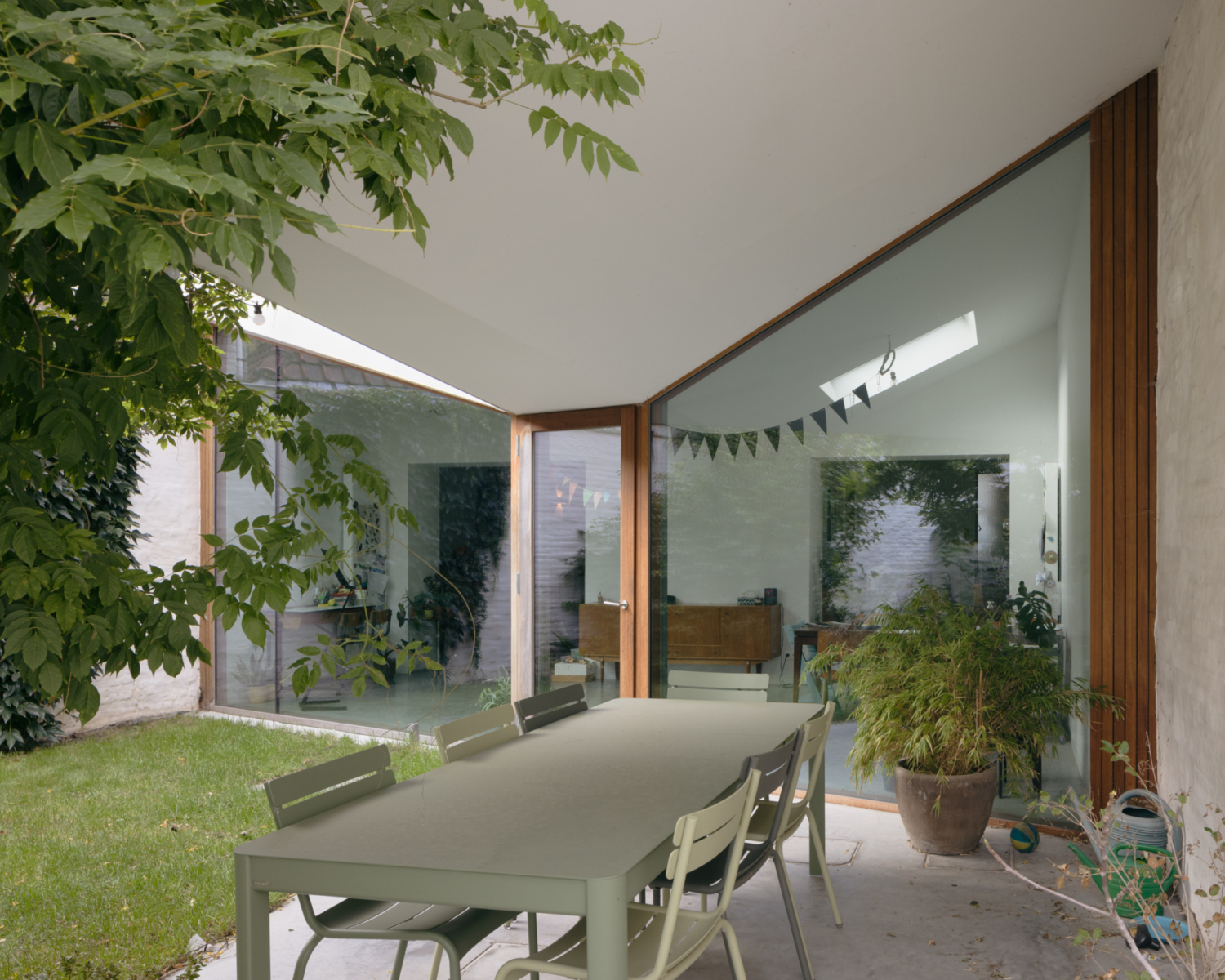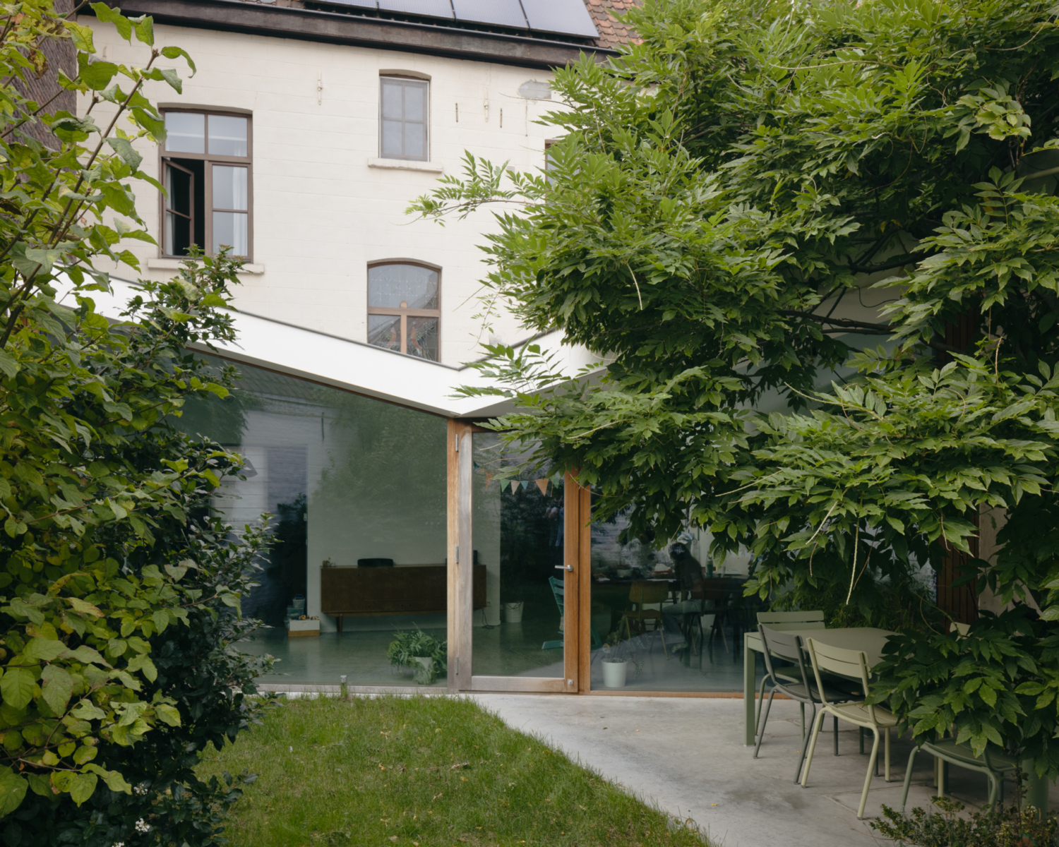 Een dak, subtiel ingevoegd tussen de verschillende tuinmuren, wordt het passtuk van de te leggen puzzel. De vleugels van het dak geven vorm aan een grote binnenruimte en een overdekte buitenruimte.