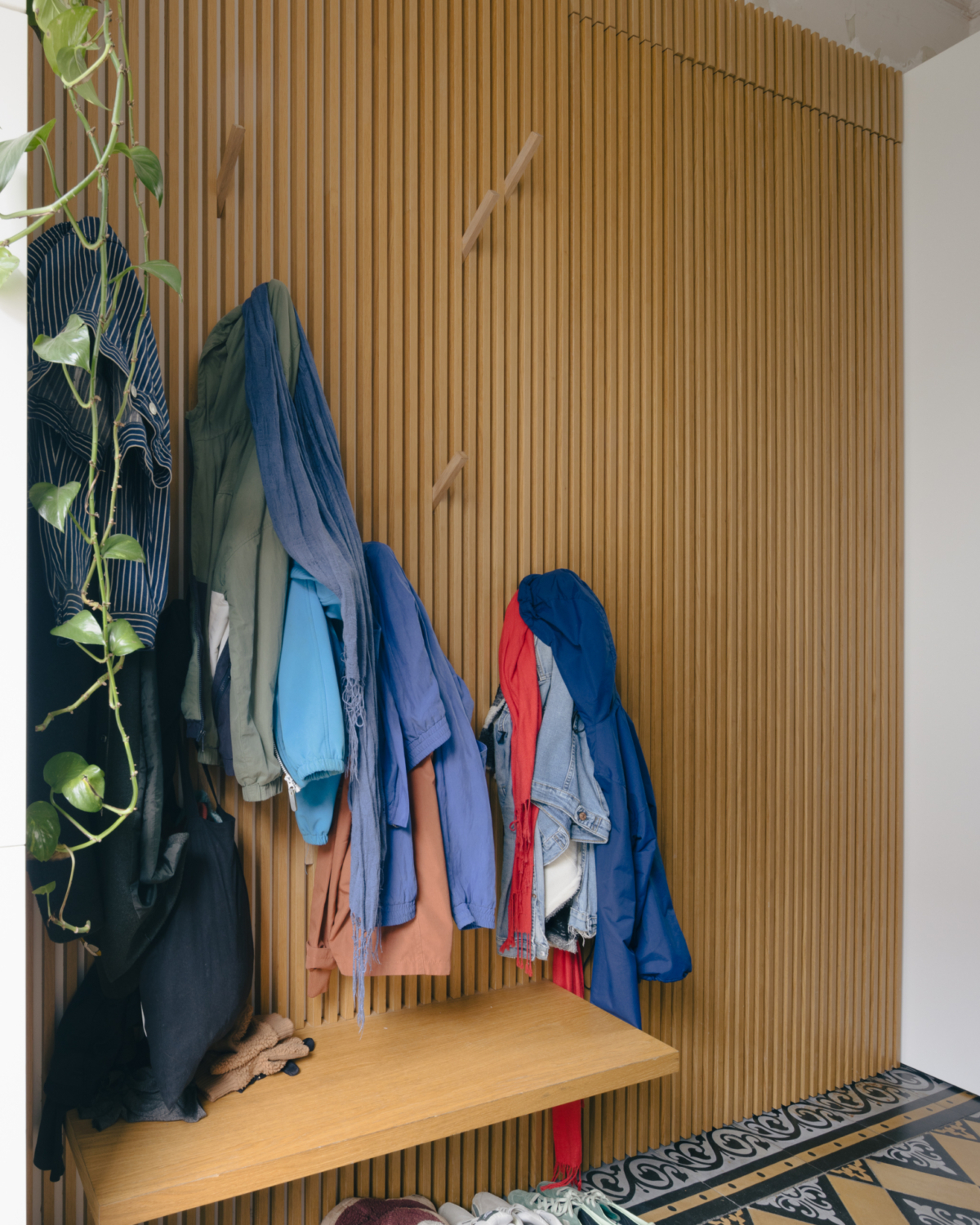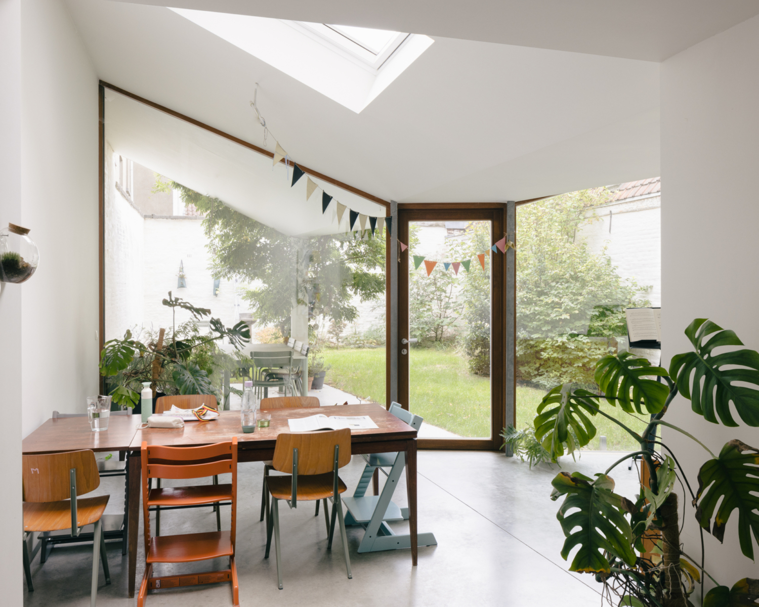 De binnenruimte verbindt de linker -en rechtervleugel van het bestaand gebouw en biedt plaats aan de eetruimte. Door deze verschuiving kan de keuken naar achter geplaatst worden met zicht op de tuin. Vooraan komt zo ruimte vrij voor een (fietsen)berging, verborgen achter de vestiaire in de inkomhal.